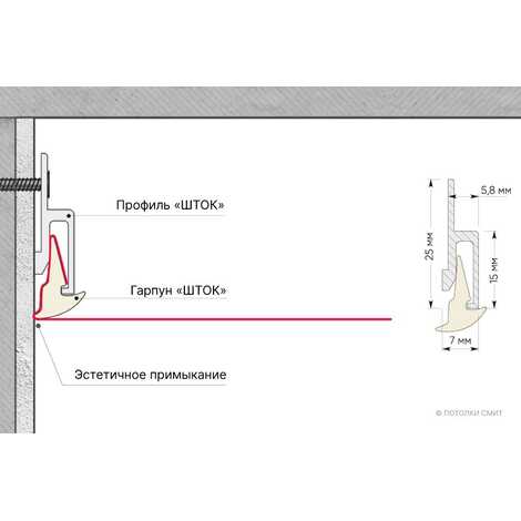 ШТОК - это бесщелевой примыкание натяжного потолка к стене с помощью специального гарпуна. Для монтажа данной системы необходимо использовать специально предназначенный стеновой багет.