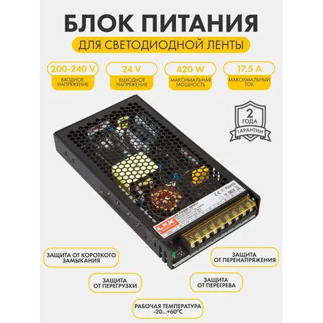 Блок питания для светодиодной ленты LUXDriver, 24В, 420Вт, 17.5А, IP20.