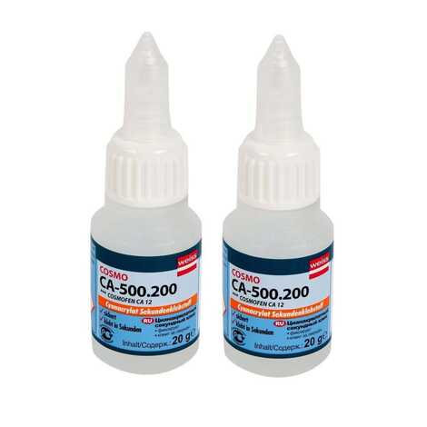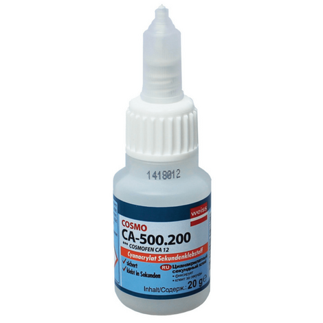 Цианоакрилатный клей Cosmofen CA 500.210 фирмы «Weiss». Это однокомпонентный быстросохнущий цианоакрилатный клей, основанный на этиле. Он характеризуется быстрым действием, приклеивание занимает всего несколько секунд. Цианоакрилатный клей Cosmofen CA 500.210 имеет многостороннее применение. Рекомендуется его применение при трудно склеиваемых предметах. Цианоакрилатный клей Cosmofen CA 500.210 наносится на одну поверхность, затем прижимается к другой до момента склеивания. Для ещё более быстрого приклеивания рекомендуется использовать активатор.
