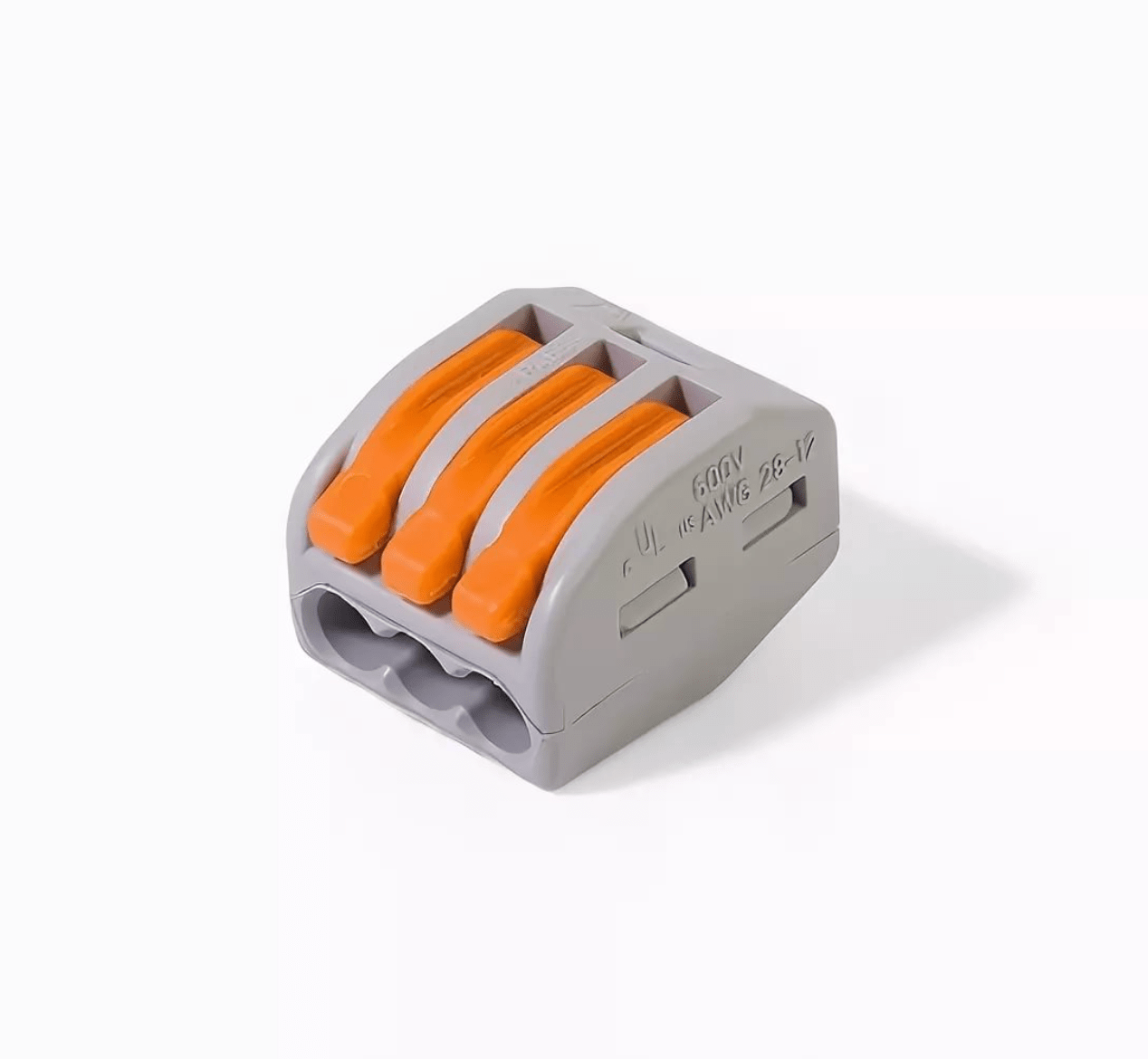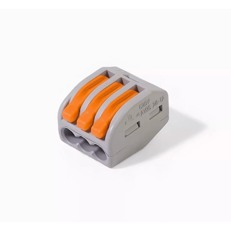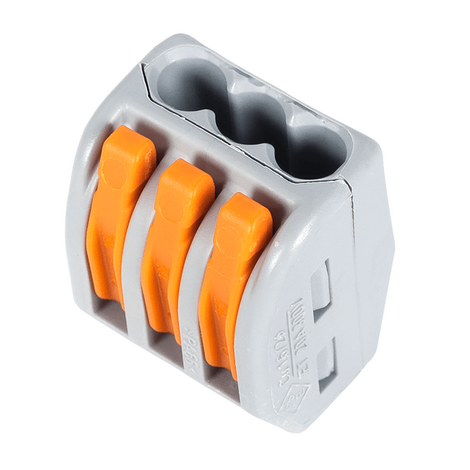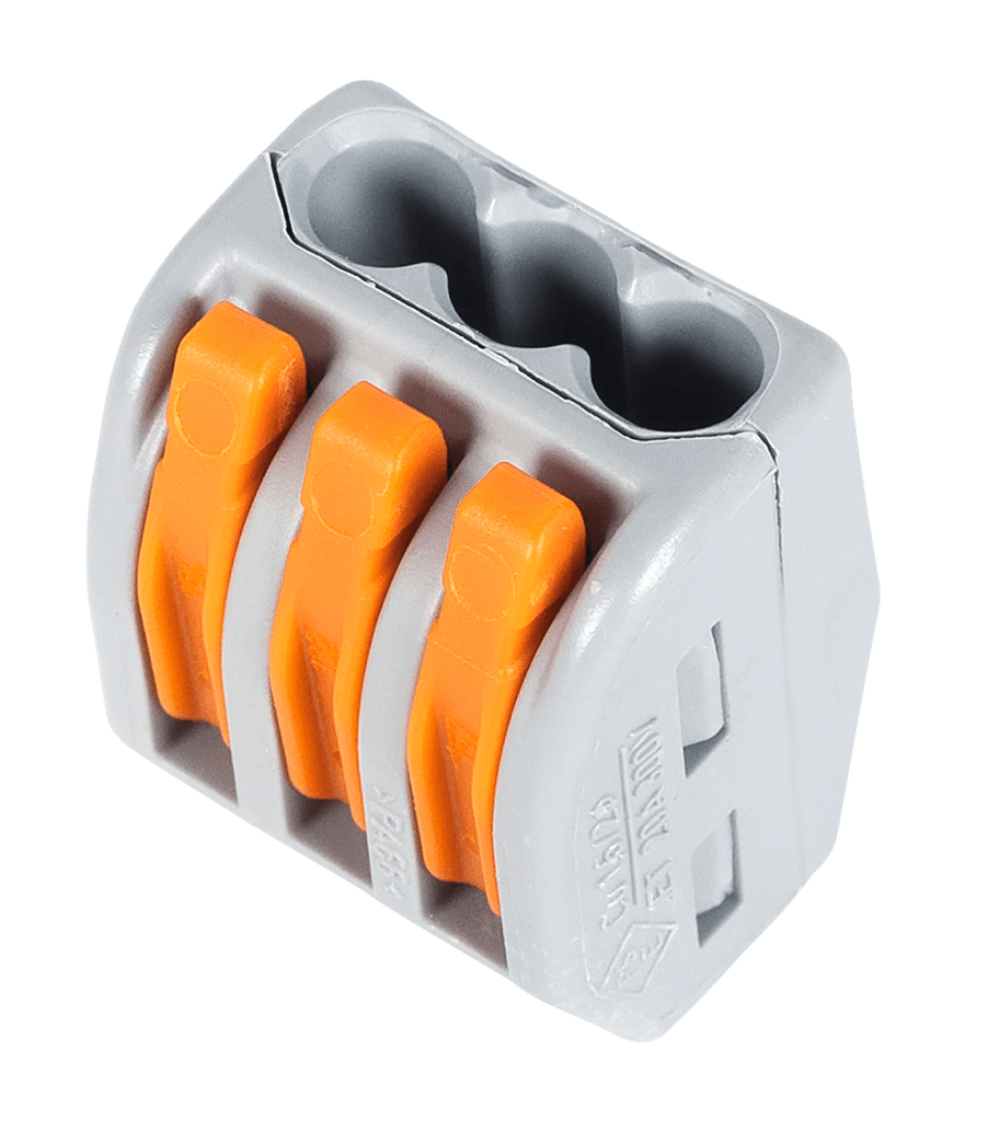 Клеммная колодка 3-х контактная с нажимным рычагом для медных одножильных и многожильных проводников сечением 0,08 – 4мм2. Рабочее напряжение 380 В, ток 32 А. Для проводников из алюминия данные клеммы заполняются токопроводящей пастой Alu-Plus.