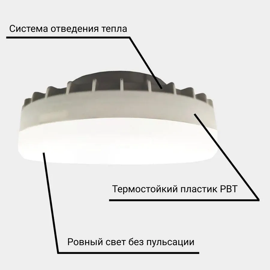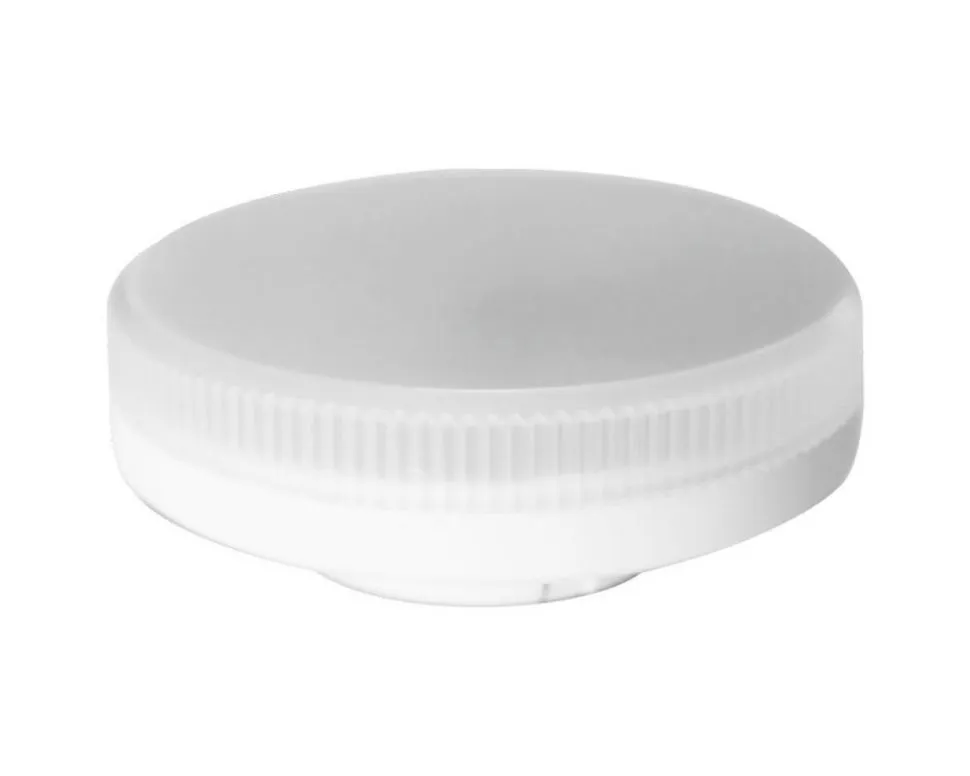 Светодиодная лампочка в форме таблетки с цоколем GX53 обладает мощностью в 12 Вт. Цветовая температура — 4200К, т.е. дневной белый свет. Изделие рассчитано на использование в сети с переменным напряжением в 175-265В.