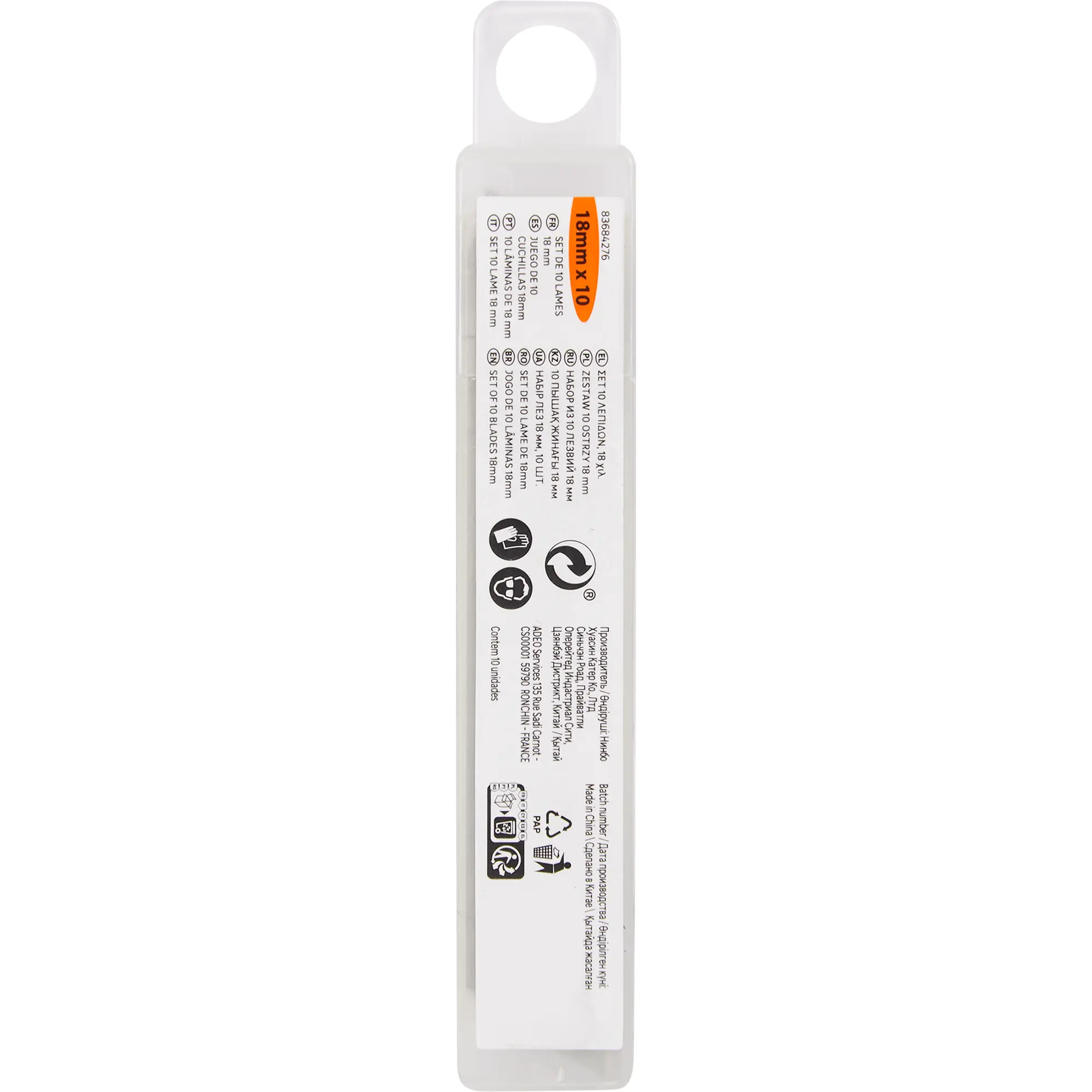 Лезвия для ножа 18 мм используются как сменные рабочие элементы в выдвижных ножах. Разделены на сегменты для отламывания пассатижами либо специальным приспособлением. По мере потери режущих качеств острой кромки полотно не заменяется целиком, а удаляется затупившийся сегмент. После использования всех сегментов в нож вставляется новое полотно. Материал лезвия — сталь. В один комплект входит 10 лезвий.