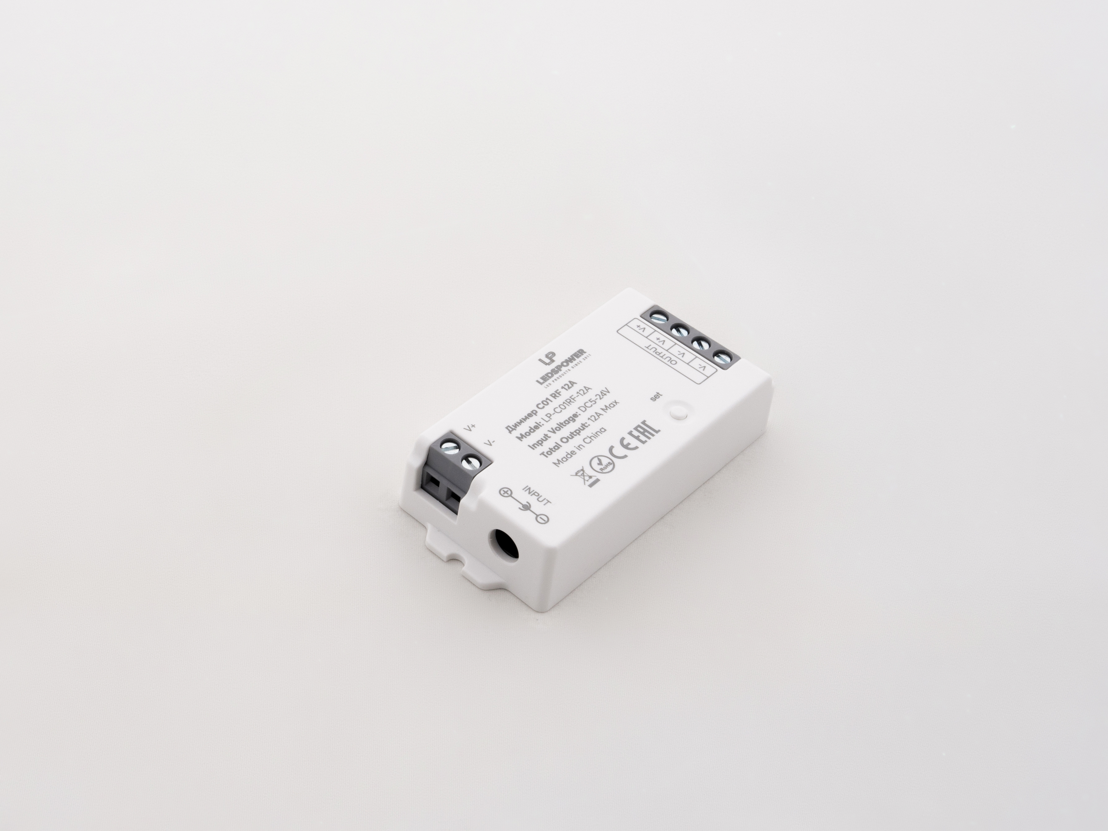 Диммер работает с одноцветной светодиодной лентой (обычно 12В или 24В) через блок питания. Для RGB или RGBW ленты нужен другой контроллер (цвета обычный диммер регулировать не сможет).