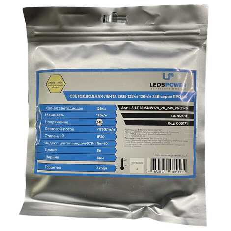 Светодиодная лента LEDS POWER (серия ПРО140), 5м, 24В, IP20, 128 LED/m, нейтральный белый.
