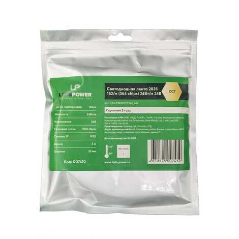 Светодиодная лента LP 2835 182/м (364 чипа) с максимальной мощностью 24 Вт на метр и питанием от 24 вольт. Степень защиты IP20. Цвет: изменяемая цветовая температура. На каждый метр ленты приходится 182 светодиода, которые обеспечивают световой поток 3120 люмен на метр. Ширина основания ленты 10 мм. Не рекомендуется использовать ленту непрерывно более 4–5 часов.