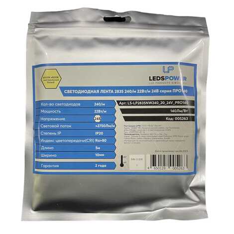 Светодиодная лента LEDS POWER (серия ПРО140), 5м, 24В, IP20, 140 LED/m, нейтральный белый.