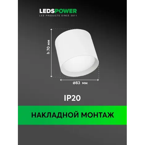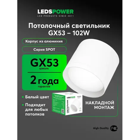 Накладной светильник GX53-102W, серия SPOT GX53 белый матовый. Рекомендуется использовать с лампами LEDS POWER. Подходит для любых типов потолков, в том числе натяжных и гипсокартоновых. Цоколь GX53, монтажное отверстие 90мм.