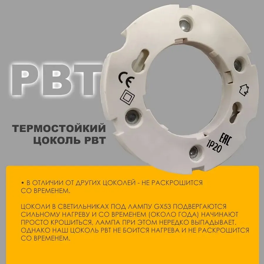 Накладные потолочные светильники этой серии в алюминиевом корпусе оборудованы термостойким цоколем, который не боится нагрева и не раскрошится со временем. Данная модель оснащена цоколем GX53 и предполагает возможность легко заменять лампы макс. мощностью до 17 Вт (лампы в комплект не входят).