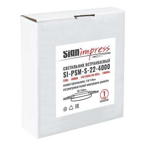 Светильник светодиодный регулируемый (до 150мм) 22Вт 4000K 1900Лм SI-PSM-S-22-4000 SignImpress. Механизм регулировки монтажного диаметра позволяет решить проблему несовпадения диаметра установочного отверстия при замене одних светильников на другие. Данный механизм избавит от дополнительных затрат на дополнительные монтажные работы, сэкономит время на подборе аналогов в заданных размерах. Светильник встраиваемый не содержат ртутьсодержащих веществ, поэтому он не представляет опасности в случае выхода из строя или разрушения. Гарантийный срок службы 1 год. Комплектация: светильник; драйвер.