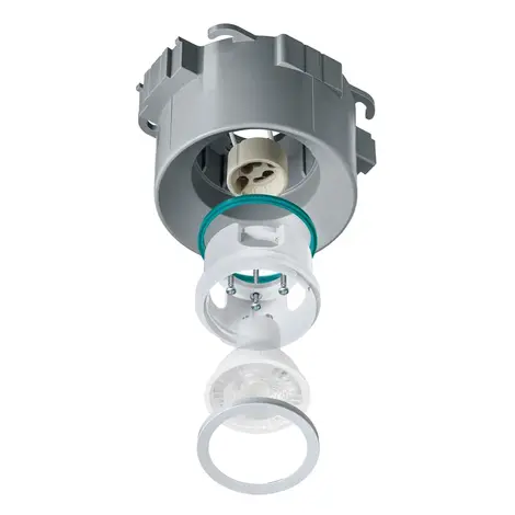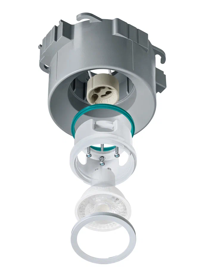 Угол светового пучка светильника — 90С. Монтаж занимает пару минут и не требует дополнительных закладных. Рекомендуем использовать для устройства лампы с цоколем GU10 мощностью до 9 Вт.