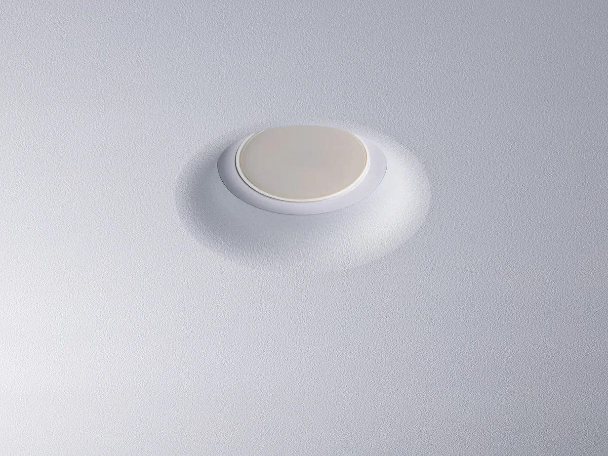 Полотно плавно загибается, светильник полностью остается за ним, а лампа утапливается внутрь на 15мм, что в совокупности создает эффект дорогого гипсокартонного потолка.