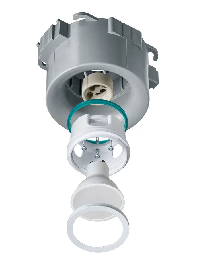 Угол светового пучка светильника — 90С. Монтаж занимает пару минут и не требует дополнительных закладных. Рекомендуем использовать для устройства лампы с цоколем GU10 мощностью до 9 Вт.