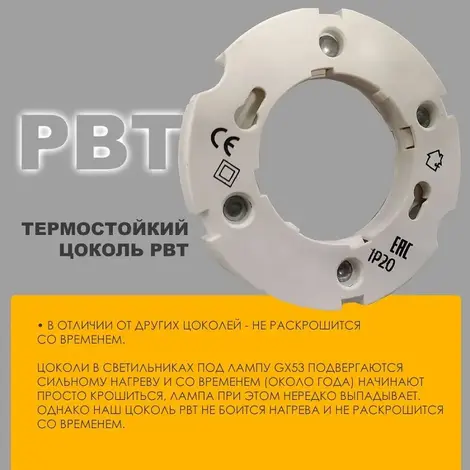 Накладные потолочные светильники этой серии в алюминиевом корпусе оборудованы термостойким цоколем, который не боится нагрева и не раскрошится со временем. Данная модель под лампу GX53 предполагает возможность легко заменять лампы, что вместе с термостойким цоколем дает долгий срок службы светильнику. Лампа в комплект не входит!