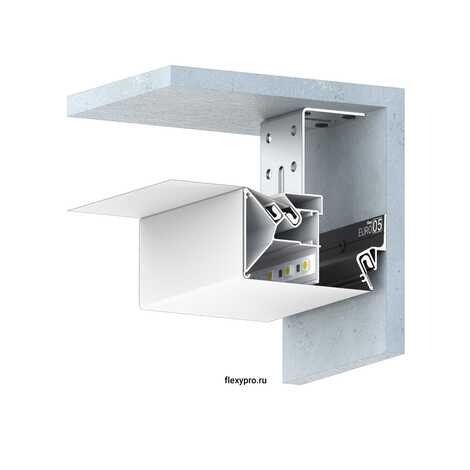 Профиль Flexy FUSION 02 для многоуровневых натяжных потолков с гарпунной системой крепления полотна. С бесщелевым примыканием полотен. С полкой для светодиодной ленты.
