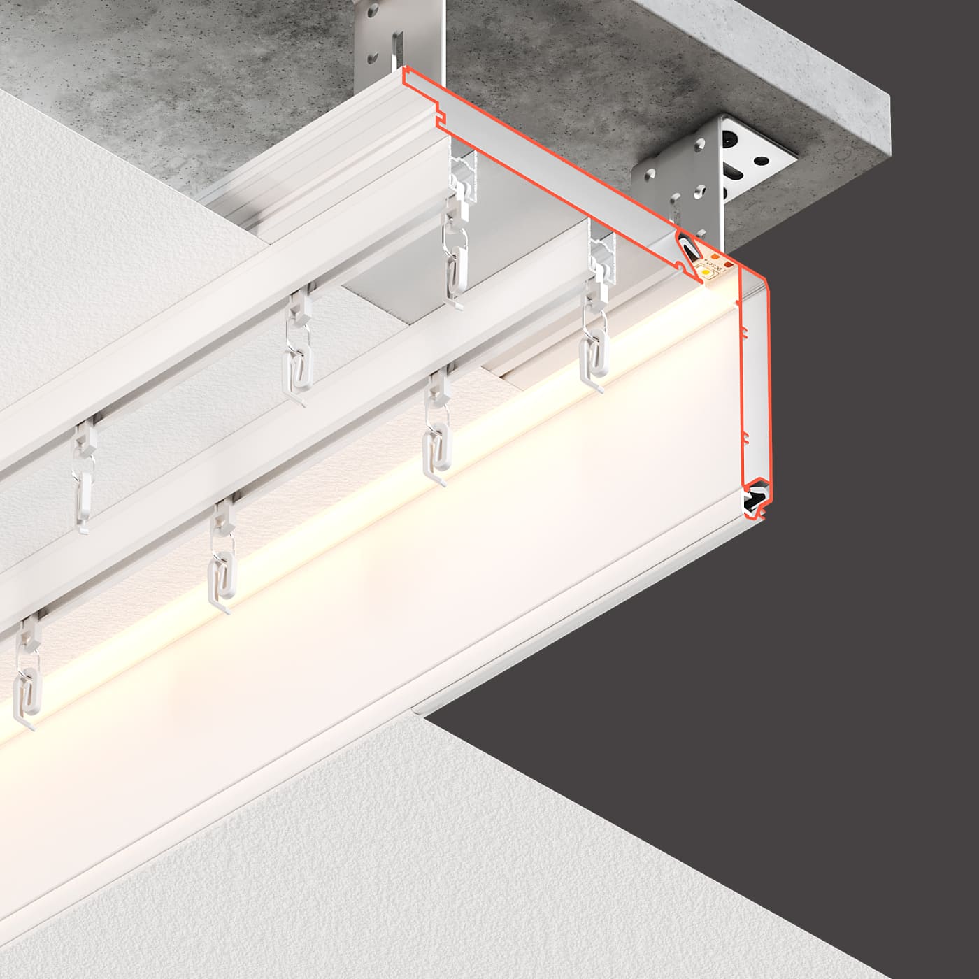 Профиль Flexy STANDART02 60 LED для изготовления прямых и угловых ниш для штор с подсветкой с последующей установкой накладных карнизов. Для гарпунной системы крепления полотна.