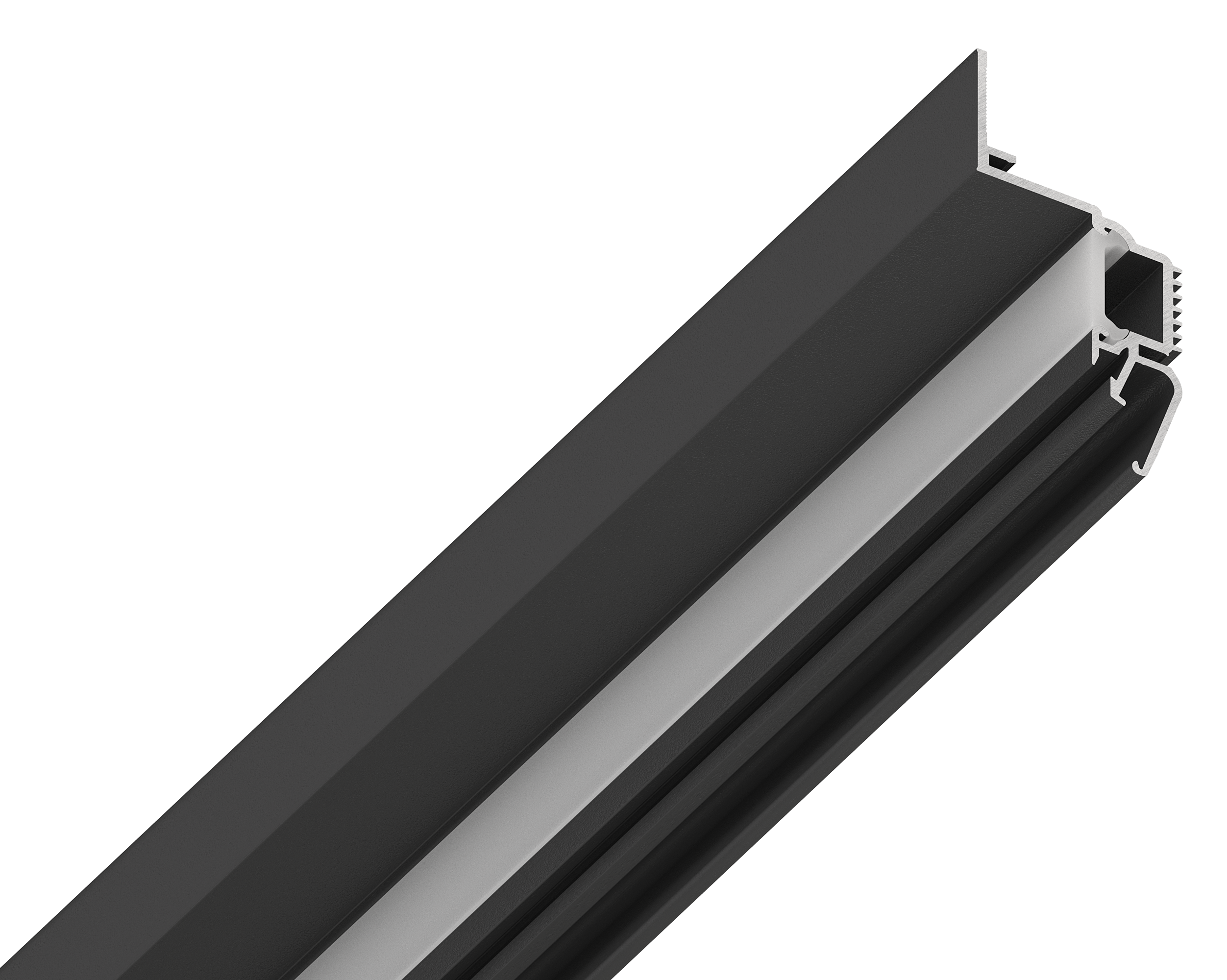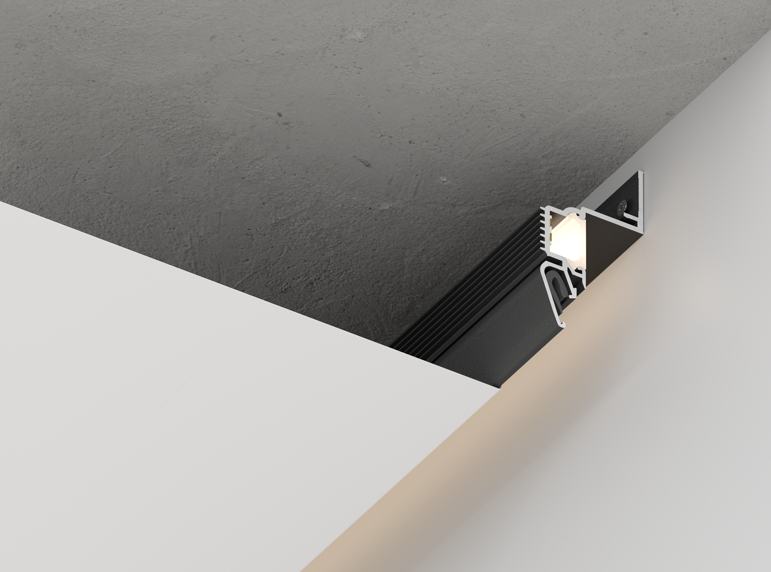 Самонесущая система с видимым отступом 25 мм от стены. Профиль оснащен пазом под гибкий рассеиватель, который дает ровный рассеянный свет, не проявляя неровности стен.