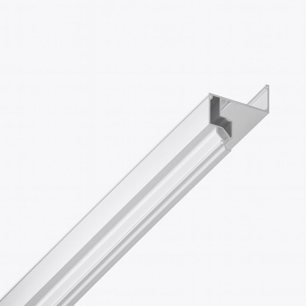 Конструкционный парящий профиль для натяжных потолков с гарпунной системой крепления полотна. Паз под гарпун закрывается вставкой. Паз для светодиодной ленты закрывается светорассеивающим экраном.