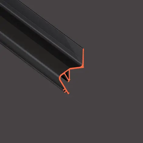Окрашенный ЧЕРНЫЙ стеновой парящий профиль Flexy FLY 02 для натяжных потолков с гарпунной системой крепления полотна. С полкой для светодиодной ленты и креплением для светорассеивающей вставки.