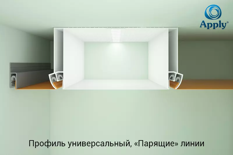 Профиль APPLY Стандарт — это конструктивный профиль для натяжных потолков, используемый для создания многоуровневых и резных конструкций, где требуется расстояние между уровнями более 4 см. Он позволяет устанавливать резные полотна на некотором расстоянии от основного или другого полотна, придавая потолку объем и возможность использовать скрытую подсветку между уровнями.