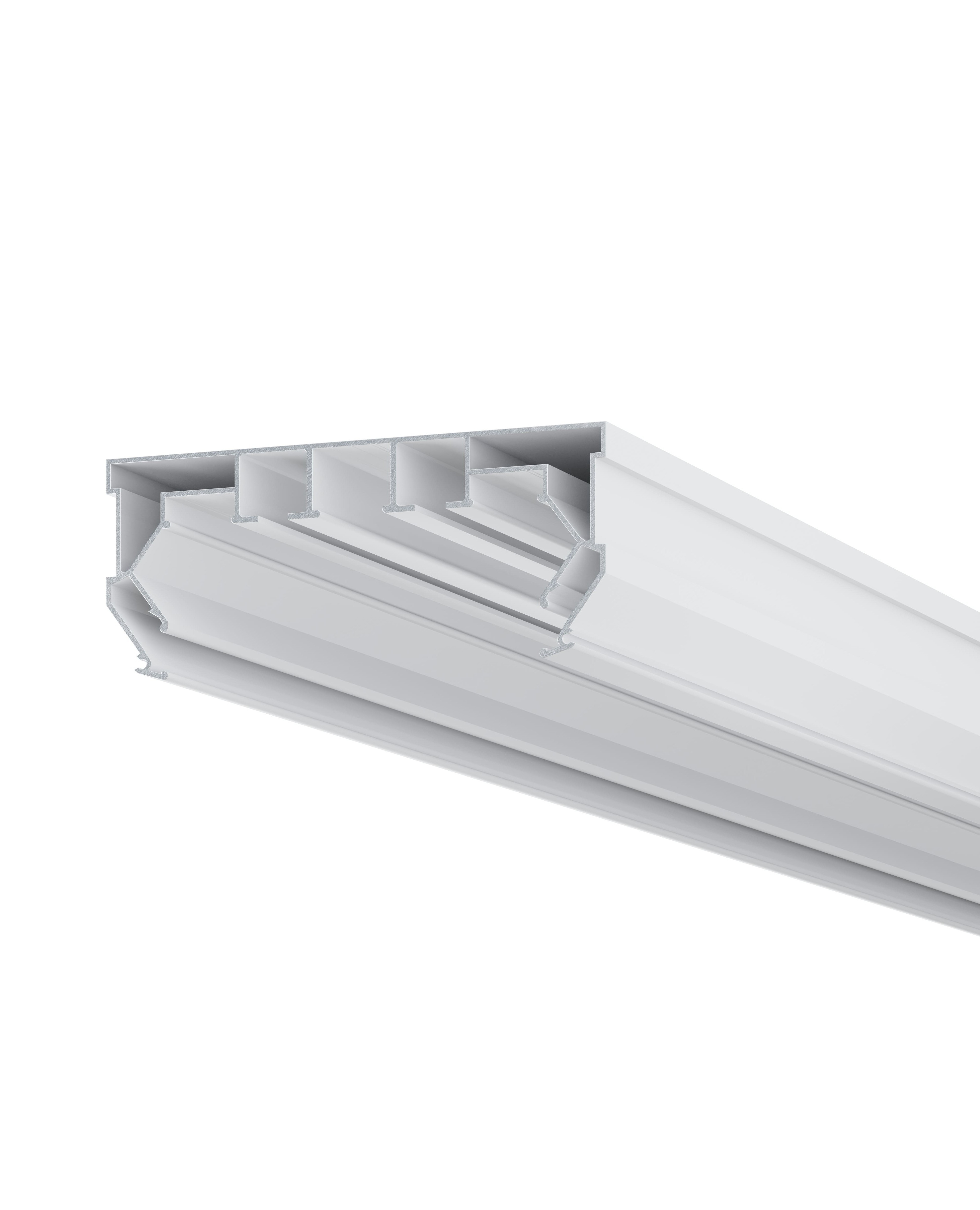 Профиль карниз ПК 14 используется для изготовления ниш под карниз. Имеется 2 ряда для крепления штор, паз под светодиодную ленту и рассеивающая вставка (приобретается отдельно), имеется вставка для гарпунного паза, для закрытия технического зазора (приобретается отдельно).